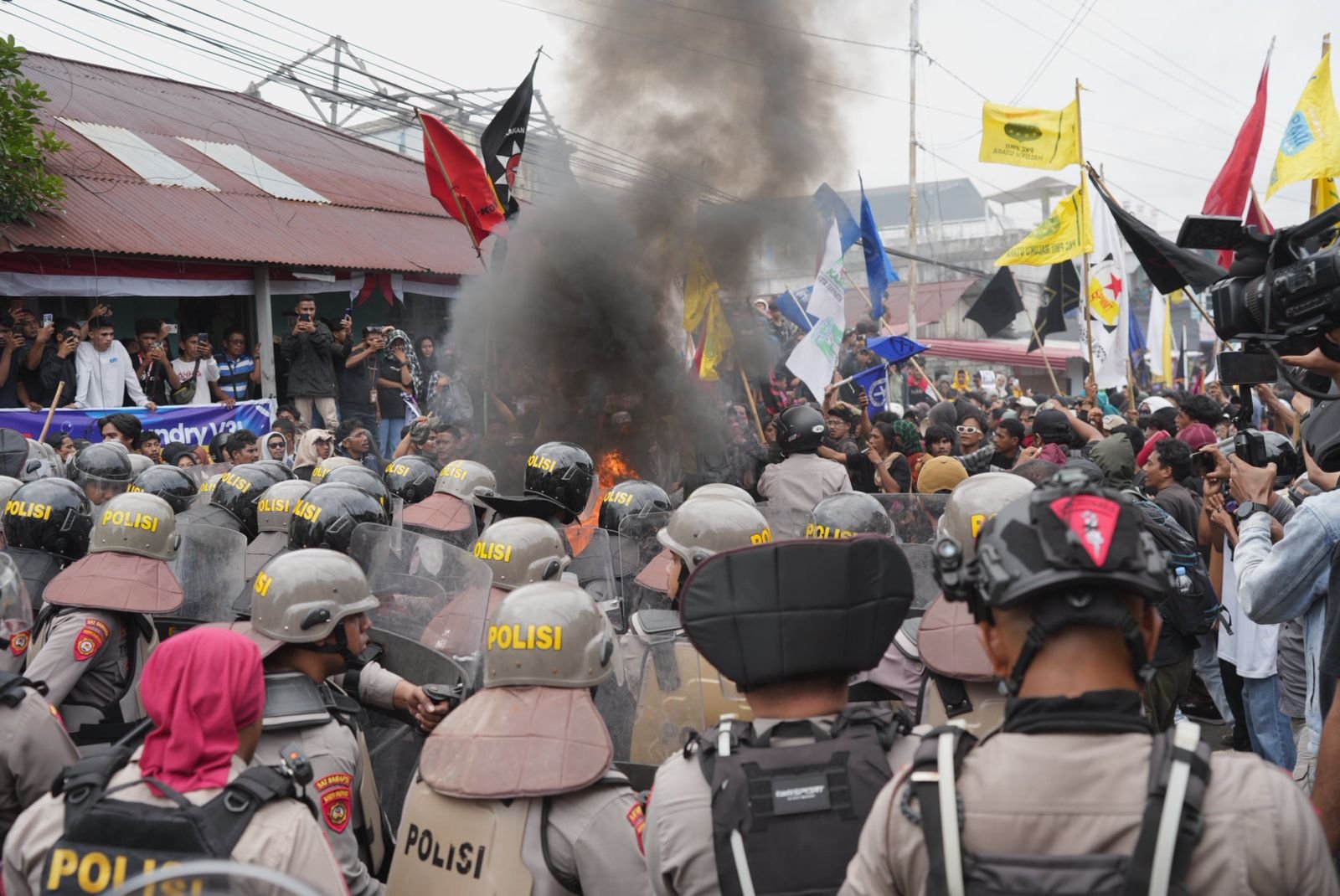 Sekitar pukul 14.30 WIT, suasana semakin tegang ketika aparat kepolisian mulai menembakkan water cannon untuk memukul mundur massa. Tembakan gas air mata kemudian dilepaskan secara beruntun setelah mahasiswa melempari aparat dengan batu dan botol air mineral. Suasana baku lempar dan dorong mendorong sempat terjadi sebelum polisi akhirnya berhasil menguasai keadaan.