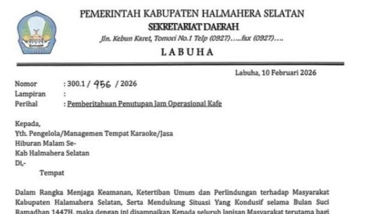 Kasedata.id – Pemerintah Kabupaten Halmahera Selatan (Pemkab) Halsel memperketat aturan jelang bulan suci Ramadhan 1447 Hijriah Tahun 2026 dengan menerbitkan surat edaran terkait penutupan operasional tempat hiburan Malam (THM) serta pengaturan aktivitas sosial kemasyarakatan lainnya.